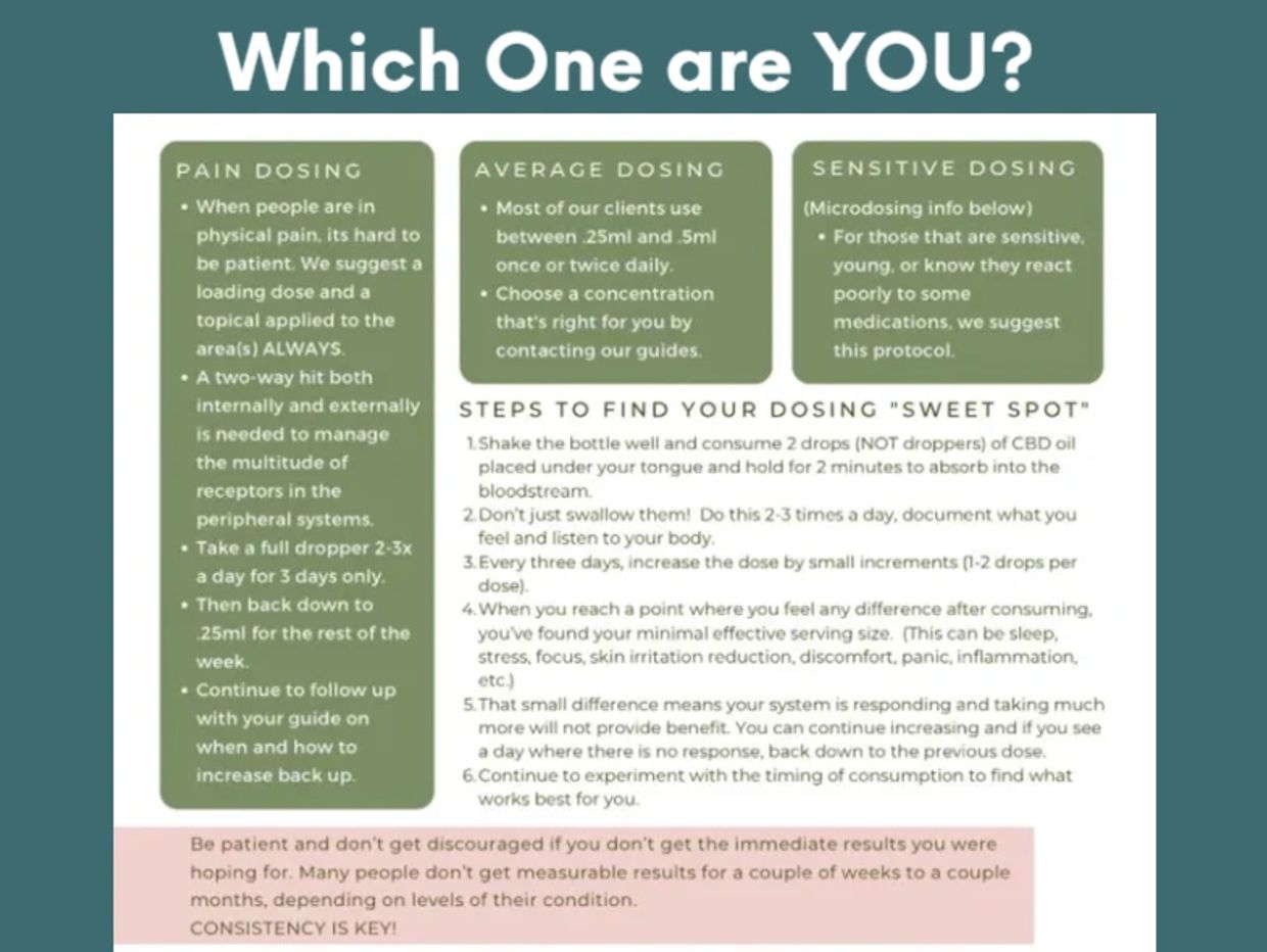 Finding the best CBD dose for your body is one of the most important factors for success using CBD. I am here to help guide you! Your “sweet spot” is the amount of CBD that gives you the desired results that you are looking for. It's important to understand that this “sweet spot” is different for each person, and its really not dependent on age, weight, or gender. Everyone’s endocannabinoid system is different. As a result, CBD users need to expect to do their own experimentation to find the CBD dose that is optimal for them, depending on several their own personal goals and health situation. Take a look at the CHART below to find the best starting point for you, and as always, reach out to me with any questions.